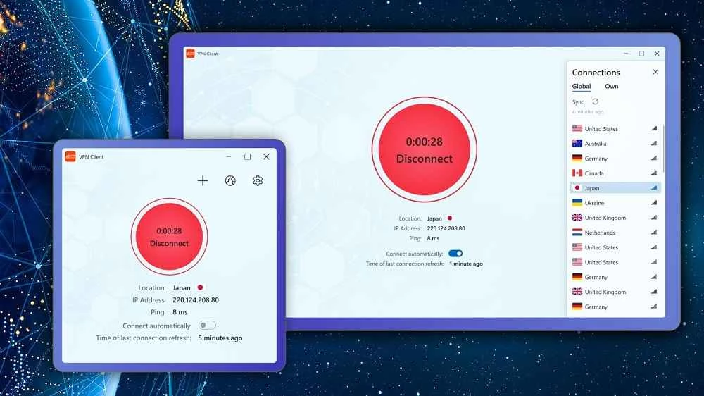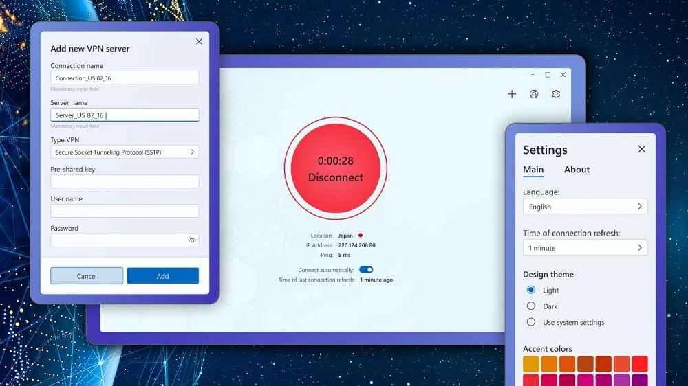 VPN Client for Windows is a handy tool to manage your online activities while encrypting your online data. It masks your real IP address and allows you to browse hassle-free while selecting your favorite server. You can use it for free, and also purchase a subscription if you want to get additional features.